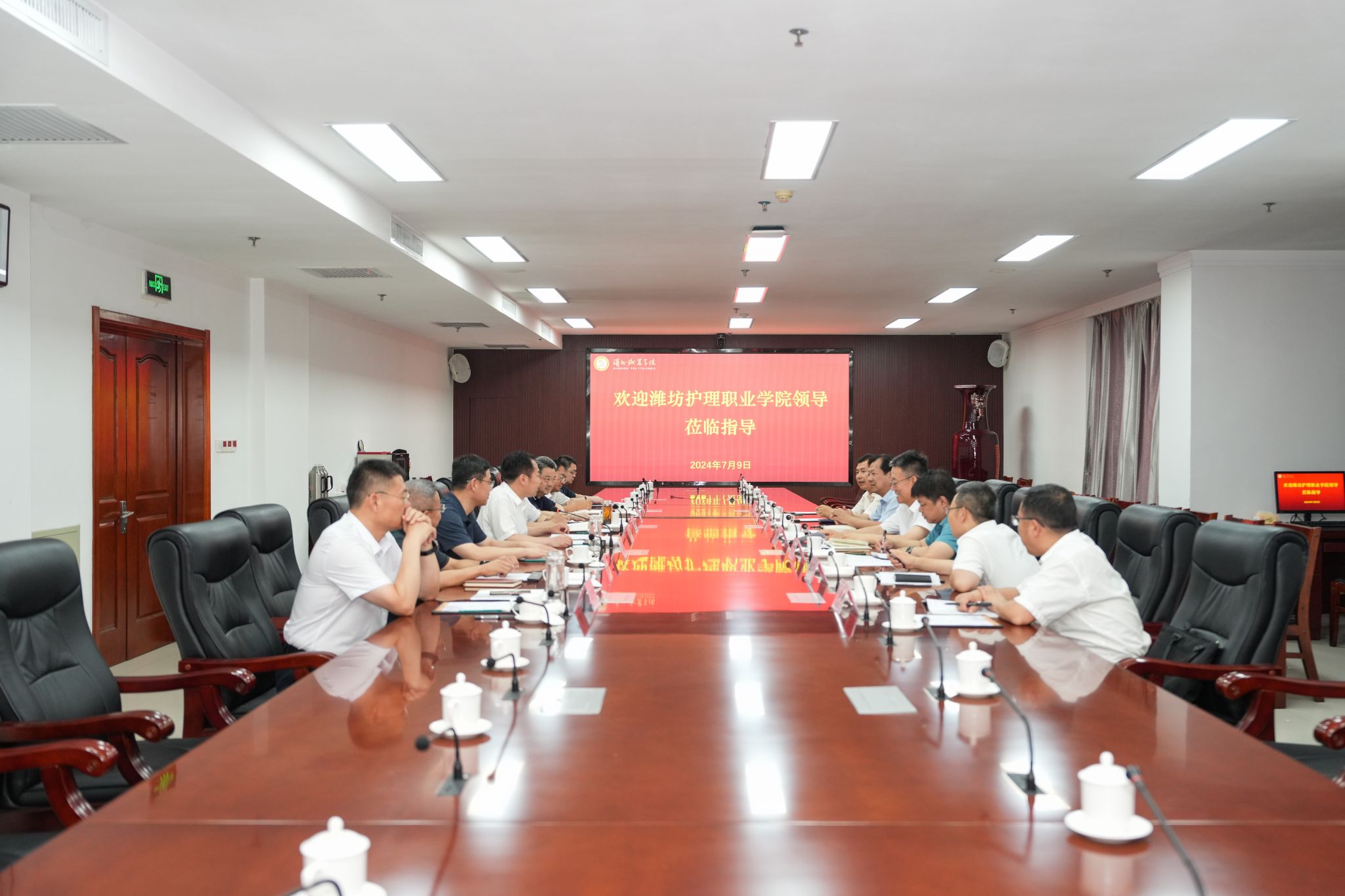 7月9日下午,潍坊护理职业学院党委书记崔照忠一行50人,就办学能力提升、产教融合深化、教学改革等情况到我校调研。党委书记刘荩一,党委副书记、院长申保忠,党委副书记范克志,党委委员、副院长宣永华、党委委员、滨州应用科技研究院院长胡洪涛,副院长李明月,党委委员、副院长王进博,党委委员、组织人事部部长李超接待客人。各院、各部门相关负责同志参加活动。