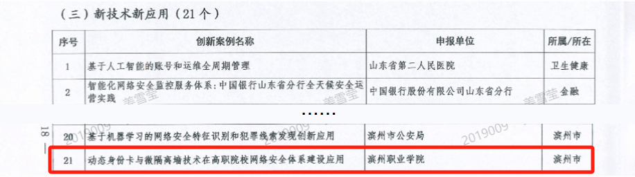 近日,中共山东省委网络安全和信息化委员会办公室、山东省大数据局联合公布 2024 年度山东省网络安全创新案例评选结果,滨州职业学院申报的“动态身份卡与微隔离墙技术在高职院校网络安全体系建设应用”项目成功入选典型创新案例。