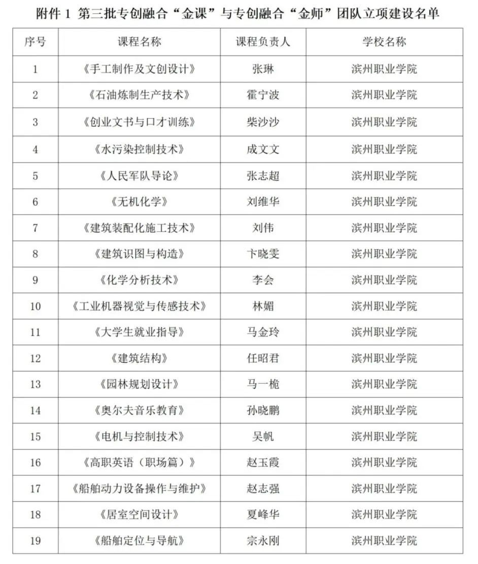 近日,根据全国高等职业学校校长联席会议双创教育专委会发布通知,滨州职业学院19项专创融合课程入选全国专创融合“金课”建设名单。学校高度重视此次专创融合“金课”申报工作,各课程团队依托扎实专业功底、创新教学理念和丰富实践经验,在激烈竞争中脱颖而出。